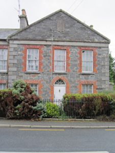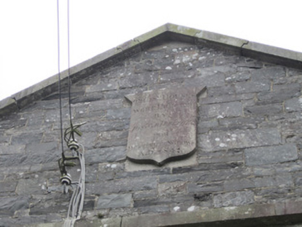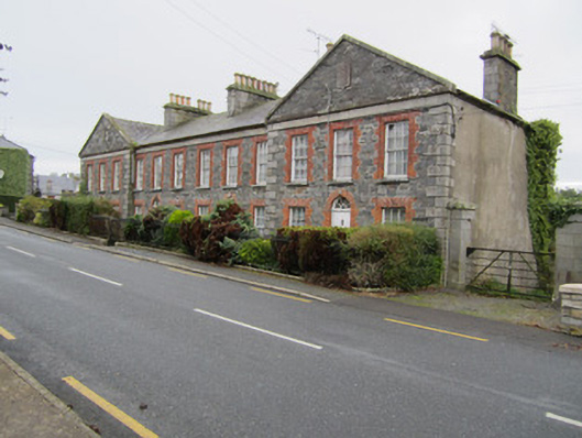 End-of terrace three-bay two-storey gable-fronted former almshouse, dated 1847, with pediment to front elevation. One of row of four almshouses at south side of Rockcorry village. Now unoccupied. Hipped slate roof, gabled to pediment, with grey clayware ridge tiles, and having ashlar coping to pediment, ashlar sandstone chimneystacks with polygonal terracotta pots, and replacement rainwater goods. Squared coursed limestone walling with rusticated block-and-start sandstone quoins, sandstone eaves course at pediment base, and chamfered sandstone plinth. Sandstone shield plaque to pediment inscribed 'THOSE HOUSES WERE ERECTED BY JOS[EPH] GRIFFITH ESQ FOR DESTITUTE WIDOWS A.D.1847'. Roughcast rendered to gable. Square-headed window openings with red brick block-and-start surrounds and voussoirs, and timber sliding sash windows, six-over-six pane to front and with mix of six-over-six and three-over-six pane to rear, with stone sills. Round-arch door opening with red brick block-and-start surround and voussoirs, timber battened door with spoked timber fanlight, and flagstone door-step with cast-iron boot-scraper. Single-cell toilet to rear having concrete walls and lean-to corrugated-iron roof. Shared garden to rear. Set back from street, with garden to front bounded by cast-iron railings and pedestrian gate on chamfered sandstone plinth.