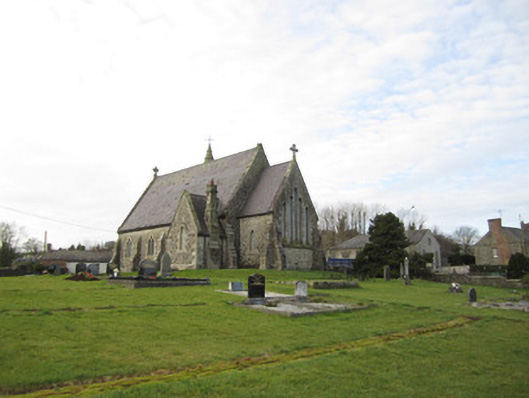 Freestanding limestone Gothic Revival Church of Ireland church, built 1854-61, probably to designs by Welland & Gillespie. Consisting of four-bay nave, lower single-bay chancel, gabled vestry to north, gabled porch and three-stage spired tower to south. Pitched natural slate roof with cut-stone copings and Celtic Cross finials, moulded cast-iron gutters, and with chimneystack to vestry. Squared and snecked dressed walls with dressed plinth having lozenge-shaped vent, stepped buttresses to corners. Upper part of tower octagonal in plan, with stepped courses above and rises to octagonal-plan belfry having moulded cornice above which is stepped-plan spire with wrought-iron weather vane. Pointed-arch double-light windows to nave with chamfered surrounds and flush sills, diagonal glazing, and with quatrefoils over. Single-light pointed-arch windows side walls of chancel and to vestry. Triple-light lancet window to west gable surmounted by trefoil, and five-light window to east gable. Belfry has loop apertures to all facets. Entrance doorways have vertically battened timber doors with wrought-iron strap hinges, hinges to main entrance being ornate, within depressed pointed-arch doorways with splayed surrounds and hood-mouldings to west elevation of tower and vestry, pointed-arch principal portal to south porch gable with deeply moulded and rebated surround. Simple aisled interior with chancel to north-east end approached via low step. Dark stained timber arch-braced A-framed trussed roof structure, supported on moulded stone corbels. Light stained timber pews and wainscoting. Dark stained timber pulpit and organ to north-east end of nave, carved granite font near south-west of interior. Stained timber railing and double-leaf timber gate dividing chancel from nave, decoratively tiled floor to chancel. Set in graveyard enclosed by rubble stone plinth wall supporting decorative wrought-iron railings and double-leaf vehicular gate set to square-plan buttressed ashlar piers.