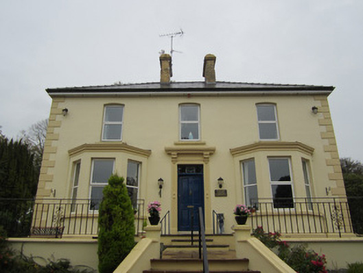 Detached two-storey three-bay house, built c.1880, with canted bays to ground level, single-bay two-storey lean-to return and single-storey flat-roof extension to rear, in use as rehabilitation centre. Hipped slate roof with centred yellow brick chimneystacks with moulded brick copings. Roofs to bay windows concealed by moulded cornice course. Replacement rainwater goods. Smooth rendered painted walls with painted block-and-start quoins, projecting plinth course to front and side elevations. Square-headed window openings to canted bays, segmental-arch window openings to first floor, with painted sills and replacement uPVC windows. Square-headed door opening with rendered architrave surround with console brackets surmounted by moulded lintel, and having timber panelled door with brass door furniture and glazed overlight. Set within own grounds with associated single-storey outbuildings. House is one of three out-of-town Victorian dwellings on Monaghan Road north-west of Ballybay town.