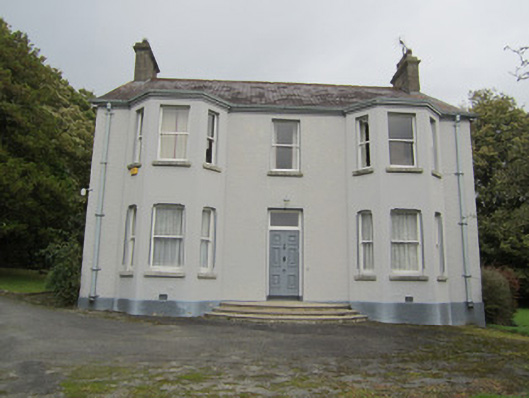 Detached three-bay two-storey house, built c.1910, with full-height canted end bays. Central two-storey lean-to return and single-storey lean-to bays to rear. Pitched slate roof with terracotta ridge tiles, smooth rendered ruled-and-lined chimneystacks with moulded cornices and terracotta pots, and moulded rendered eaves course. Timber gable-braces and bargeboards with pinnacle finials. Cast-iron profiled guttering and cast-iron square down pipes with trefoil holderbats. Roofs of canted bays concealed. Roughcast rendered walls with smooth rendered plinth to front elevation. Square-headed window openings, shouldered to ground floor of canted-bays, with one-over-one pane horned timber sliding sash windows and stone sills. Square-headed door opening with rendered surrounds, overlight and timber panelled door. Segmental-plan stone steps to entrance. Gateway comprising wrought-iron double-leaf gate mounted on smooth rendered piers to west. Single-storey lean-to outbuilding to rear. House is located to north of Ballybay town, accessed by farm track from south.