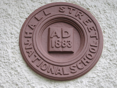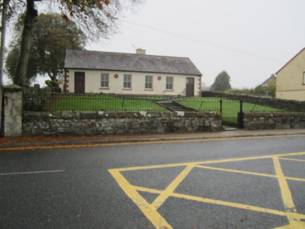 Detached six-bay single-storey former temperance hall and national school, built 1878, in use as hall, with two-bay single-storey extension, 1883, to north-west and single-storey lean-two extension at rear. Pitched natural slate roof with overhanging eaves with exposed joists, and replacement uPVC rainwater goods. Roughcast rendered walls with painted tooled masonry block-and-start quoins, and smooth rendered plinth. Roundels to front elevation with moulded surrounds reading 'HALL STREET NATIONAL SCHOOL A.D. 1883' and 'THE TEMPERANCE HALL A.D. 1878'. Further date-stone to east gable inscribed '1885'. Square-headed window openings with rendered patent surrounds and two-over-two pane horned timber sliding sash windows, and pained sills. Square-headed door openings to end bays with rendered patent surrounds and replacement battened timber door with overlights. Set within own grounds, with dressed stone wall to road frontage having rubble-faced, chamfered coping surmounted by railings of wrought iron; centred pedestrian gateway giving access to stone steps and Y-planned pathway. Former teacher’s house to north, of three bays and two storeys, with coursed rubble limestone walls with sandstone quoins, pitched slate roof and with cast-iron railings and gate to front to rubble limestone wall. Ballybay Second Presbyterian Church to west. Located west of Ballybay town centre.