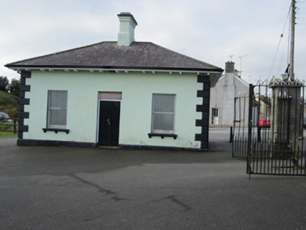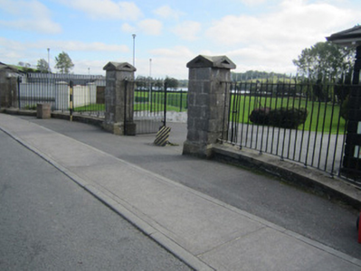 Former demesne gateway, erected c.1840, to now-demolished Ballybay House. Comprises four square-plan piers of tooled ashlar limestone with chamfered plinths and pedimented caps, arrow-head wrought-iron double-leaf gate mounted to central piers; low broad-S-curve ashlar flanking walls surmounted by saddle-back copings and arrow-head railings with cast-iron collars to bases. Detached three-bay single-storey former gate lodge inside gateway, built c.1840, now in use as house. Hipped slate roof with grey clayware ridge tiles, overhanging eaves with timber soffits supported by paired timber brackets, stepped smooth rendered chimneystack stack, and replacement rainwater goods. Painted smooth rendered walls with rusticated block-and-start quoins and projecting plinth course. Square-headed window openings with one-over-one pane horned timber sliding sash windows, with metal grid window protectors, moulded stone sills with corbelled brackets. Square-headed door opening with replacement double-leaf timber battened door with boarded-up overlight. Located east of Ballybay town centre forming entrance to public park.