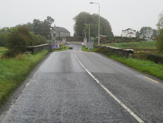 Two-arch slightly humpbacked stone bridge, built c.1760, carrying Castleblayney to Newtownhamilton road over stream linking Drumillard and Muckno Loughs. Walls of uncoursed rubble sandstone with segmental arches having heavy, punch-finished ashlar voussoirs and punched chamfered string course narrowing wing walls and spandrels to parapet wall with heavy, punched flat coping stones. Parapets are terminated on both sides by square piers and are splayed slightly outward on each side of road crossing with some recent repairs with guillotined stone to south-east parapet. South-east parapet abuts low rubble stone field wall continuing on both sides of bridge. Bridge surface has soft grass margin to each side and no positive drainage. Upstream and downstream sides both have curved, pointed cutwaters.