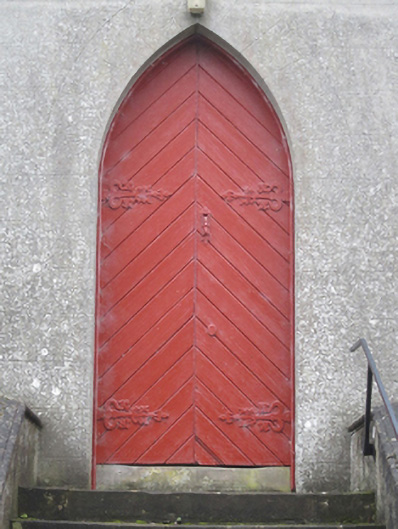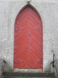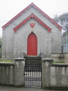 Detached five-bay single-storey hall, dated 1891, with gabled entrance porch to north-east façade and gabled extension to south-west elevation at rear of original hall structure linking it with four-bay late twentieth-century extension to south-west. Pitched fibre-cement tiled roof to both original main hall structure and lower entrance porch with ornate pierced timber bargeboards to both, and replacement metal gutters held on small rounded stone corbels at eaves, and cast-iron downpipes. Original hall building has ruled-and-lined smooth cement rendered walls with rusticated smooth render block-and-start quoins and two-centred arch window openings which have four-over-four pane timber sliding sash frames with convex horns and stone sills. Pointed window openings to the smooth cement rendered rear extension have replacement uPVC frames. Stone shield over main entrance doorway, with date. Two-centred arch doorway opening double-leaf timber-sheeted pointed doors with ornate iron hinges. Roughcast cement rendered front wall with heavy cast-iron gate held on octagonal roughcast rendered piers leading to sandstone steps up to main entrance doorway.