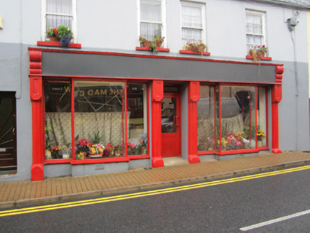 Terraced four-bay two-storey house, built c.1830, formerly two two-bay houses, with shop to ground floor. Pitched fibre-cement slate roof with black clay ridge tiles. Rendered and brick chimneystacks, with single projecting course to northern stack and stepped courses to southern. Half-round cast-iron gutters fixed to smooth rendered platband with wrought-iron brackets and round-profile downpipe. Painted smooth rendered walls, with render and timber shopfront. Uneven but symmetrically spaced square-headed one-over-one pane timber sliding sash windows to first floor with convex horns to northern bays and two-over-two horizontal-pane to southern bays, all with painted stone sills. Engaged render columns with cubic bases and capitals frame central doorway with partially glazed replacement timber door with overlight and ramped concrete access. Ordnance Survey benchmark carved into smooth rendered reveal of door, either side of which are large, square canted display windows with fine timber glazing bars to junctions, and moulded timber sill over low smooth rendered stall riser. Blank fasciaboard held by columns with moulded timber cornice and fluted consoles to each end. Square-headed doorway to north end of shopfront providing access to house over shop, with replacement glazed timber door.
