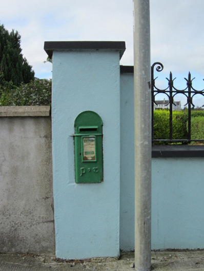 The modest form of this box is enhanced by the simple and well executed raised lettering. The use of Gaelic lettering was common on public structures in post-Independence Ireland. It is located adjacent to a former smithy, which would have been a focal point for the local community. The postbox is still in use today.