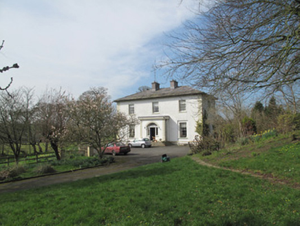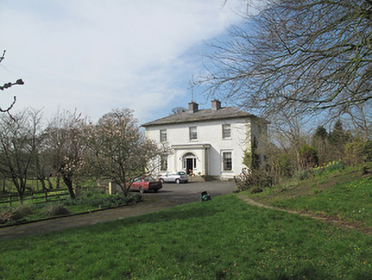 Detached L-plan three-bay two-storey over basement former glebe house, built 1821, having shallow flat-roofed porch to front (south-east) elevation. Hipped slate roof with red brick chimneystacks, terracotta ridge tiles, mixed cast-iron and replacement rainwater goods and timber corbelled eaves. Roughcast rendered walls having channelled tooled stone quoins and plinth course, and render eaves course. Smooth render to porch with channelled quoins. Square-headed window openings having painted masonry sills and six-over-six pane timber sliding sash windows. Ground floor windows to front, north-east, and north-west elevations set within recessed panels. Paired two-over-two pane timber sliding sash windows to north-east elevation of rear wing, with wrought-iron bars. Some replacement uPVC windows to rear (north-west) elevation. Square-headed window openings to south-west elevation at basement level, having six-over-six pane timber sliding sash windows, and wrought-iron bars. Central window blocked. Segmental-headed door opening to porch with timber panelled door flanked by timber mullions and sidelights supporting moulded cornice and cobweb fanlight, opening on to limestone flag platform and four splayed steps. Square-headed opening at basement level to rear having timber panelled door. Site entrance having double-leaf wrought-iron gates flanked by square-profile roughcast rendered piers with roughcast rendered quadrant walls, terminating in square-profile piers, to south-east of house.