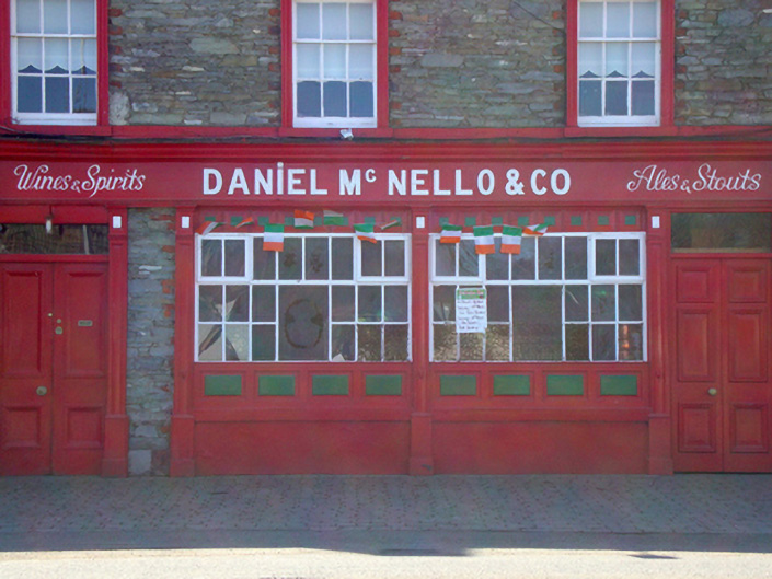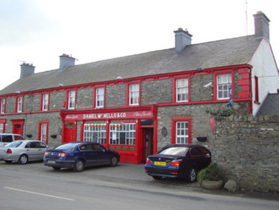 Attached eight-bay two-storey public house, former post office and dispensary, built c.1780, now in multiple use as public house and private accommodation. Six-bay public house to west and two-bay private dwelling to east. Pitched slate roof, gabled to east and west, with replacement slates and clay ridge-tiles, having some cast-iron rainwater goods and some replacement uPVC rainwater goods. Lined-and-ruled cement rendered chimneystacks having terracotta pots. Rubble stone walls, having timber brackets to rendered eaves course and rendered sill course to first floor windows. Square-headed window openings with brick quoins and painted moulded timber window surrounds, with three-over-six pane timber sliding sash windows with variety of horns to first floor of north elevation, and replacement uPVC windows to ground floor. One six-over-six pane timber sliding sash window to east of shopfront, having painted stone sills, exposed brick quoins and gauged brick arch to opening. Square-headed display window and square-headed door opening to two most easterly bays introduced in early twentieth century. Late nineteenth-century carved timber shopfront to pub having ornate foliate console brackets to timber entablature. Painted 'DANIEL MCNELLO & CO.' lettering to fascia. Square-headed raised and fielded double-leaf door opening on either side of shopfront, separated by carved timber engaged pilasters and panelled stall-riser below replacement uPVC windows. Exposed screen wall to west with rendered and painted coping over integral gauged brick segmental-arch opening, and gauged brick camber-headed door opening having timber battened door, exposed screen wall continuing to west. Single-storey ancillary buildings to east, likely to have been farm buildings, later used for commercial purposes, now in use as private accommodation. Nineteenth-century two-bay two-storey roughcast extension to rear, with M-profile roof and rendered rectangular plan chimneystacks, square-headed window openings with original three-over-six pane timber sliding sash windows to first floor south elevation, nineteenth-century sash windows to west and south elevations, and recent single-storey extensions to west and south (rear) elevations. Located prominently facing north at Finnegan's Cross at the main intersection of Inishkeen village.