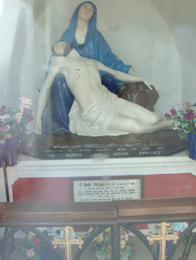 Freestanding memorial shrine, built c.1950, containing plaster statue of the Pieta, re-erected from unknown location. Gable-fronted rectangular-plan concrete housing with pitched concrete roof having carved stone cross to apex. Lined-and-ruled rendered walls with concrete-rendered corner piers to east elevation having tooled stone crenellations. Pointed-arch door opening with chamfered surround and replacement uPVC door. Stylised diamond-shaped window openings to north and south elevations, having stained glass with flower motif tracery. Plaster statue on plinth of the Pieta, with Mary holding Christ after the Crucifixion. Guarded by timber gate of pointed arches and crucifixes to interior.