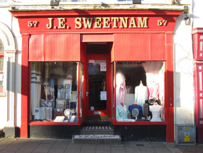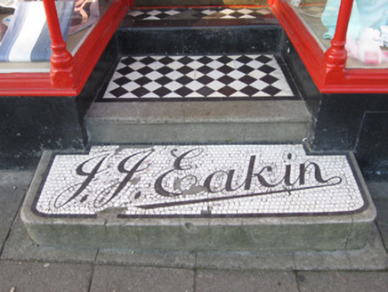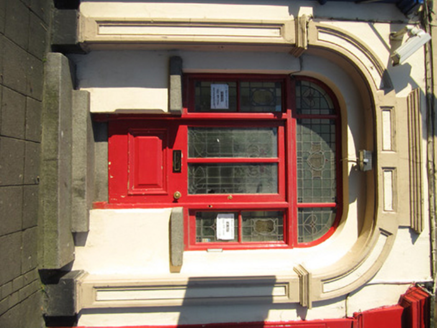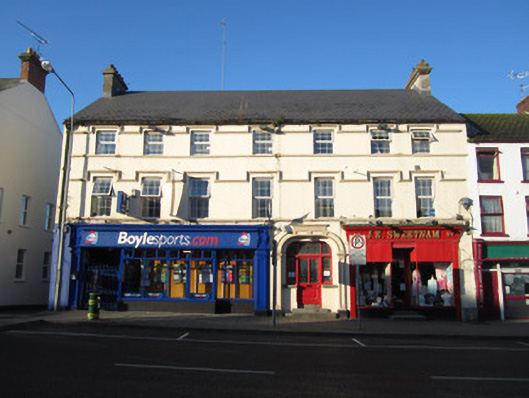 Attached seven-bay three-storey building, built c.1780, formerly house(s), with timber shopfronts, that to south end being recent. Facade altered c.1900. Pitched slate roof with smooth rendered chimneystacks to gable ends having smooth rendered copings and terracotta pots to gable ends, smooth rendered eaves course and remnants of cast-iron rainwater goods. Smooth rendered walls, with continuous sill-level moulded string courses and hood-moulding courses to upper floors. Square-headed window openings to upper floors, with replacement uPVC windows. Elliptical-headed entrance, c.1900, comprising glazed panelled timber door, with stained-glass panels, stained-glass sidelights and overlights, flanked by panelled pilasters and archivolt, and approached by ashlar granite steps. Northern shopfront comprises pilasters with incised detailing, plain fascia with raised recent lettering, moulded cornice, recessed recent glazed timber door flanked by plate-glass display windows with colonettes and rendered stall risers, approached by three steps having mosaics and tiles, outermost bearing name 'J.J. Eakin'.