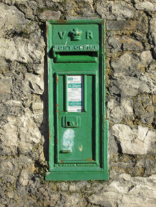 Cast-iron wall-mounted post box, c.1880, with royal insignia of Queen Victoria and crown. Maker's mark, 'W.T. Allen & Co. London', to base and 'Post Office' to letter slot. Set in rubble retaining wall of graveyard of Church of Ireland.