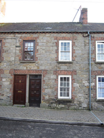 Terraced two-bay two-storey house, built c.1840. Pitched slate roof with red brick chimneystack with smooth rendered coping and terracotta pots, red brick eaves course, and cast-iron rainwater goods. Coursed random rubble limestone walls. Square-headed window openings with six-over-six pane sliding timber sash windows, red brick block-and-start surrounds and stone sills. Square-headed door opening with recent timber panelled door, paired with adjoining property's door within single opening with red brick block-and-start surrounds, limestone plinth blocks and smooth rendered reveals, with stone sill.