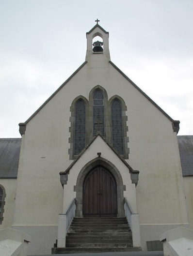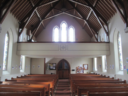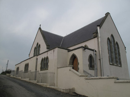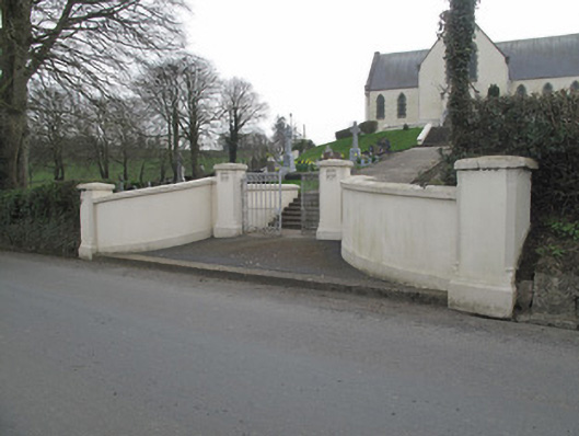 Freestanding gable-fronted rendered Early English Gothic Revival Roman Catholic church, built 1787 and rebuilt 1936-8 to designs by Thomas Cullen of Dublin. Cruciform plan, comprising three-bay nave to east, transepts to north and south, and single-bay chancel to west (all with same ridge and eaves levels). Porch to nave gable, and flat-roofed sacristy and service room extension to rear of chancel and transepts. Pitched slate roof having roll-top blue/black terracotta ridge tiles, limestone verges with cross finial to chancel gable, replacement half-round profile metal gutters. Gabled rendered openwork bell-cote with stone verges and cross finial, pointed-arch aperture containing bronze bell (foundry mark and date not visible). Painted rendered walls over rendered chamfered plinth. Pointed-arch window openings with leaded-glass lancets, splayed flush sandstone surrounds and sills (blocked to lower levels by extension), and with stepped tripartite window openings to gables. Pointed-arch door openings having stained and varnished vertically-sheeted timber door to south and west elevations of extension (double-leaf accessed by eleven-step flight of stone steps to porch to principal east entrance), with splayed sandstone surrounds throughout. Set back from crossing in rural road by low boundary wall and grid-laid graveyard on elevated sloping site rising to northwest. Tarmacadam parking area to north, access drives to north-east and west, mature trees to south-west, ancillary modern structures and residences to west and north of parking area and drive. Interior access via porch into nave via pointed-arch varnished and stained timber double-leaf door with stained-glass panels over lock-rail. Painted timber panelled gallery to nave gable with raked benches and accessed by gable-side stairs. Varnished and stained timber scissor-truss exposed roof structure, with principal rafters supported on carved stone corbels, purlins, and painted minor rafters to roof soffit panels. Painted plaster walls with splayed embrasures, leaded stained-glass lancets. Free-standing varnished timber benches on timber sheeted floors flanking central Minton-tiled aisle (in basket-weave design with diamond margins) to nave and between wall-bordering aisles.
