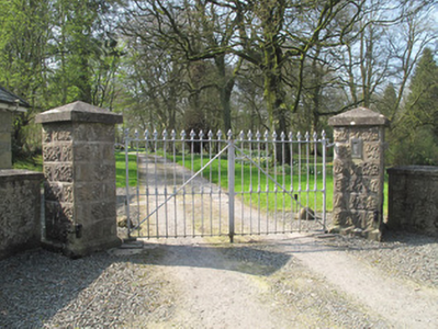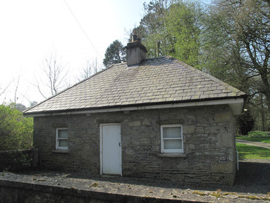 Detached three-bay single-storey gate lodge, built c.1838. Hipped slate roof with rendered chimneystack and cast-iron rainwater goods. Coursed rubble limestone walls having roughly-squared block-and-start quoins. Square-headed window openings with limestone lintels, render sills and one-over-one pane timber sliding sash windows. Square-headed door opening to front (east) elevation having limestone lintel and timber battened door. Roughcast rendered boundary wall with render coping to front, gateway to north-east of house comprising pair of square-plan vermiculated limestone piers having render capping and double-leaf decorative cast-iron gate.