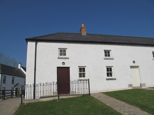 This modest house terminates a terrace of houses which are largely identical in scale and form. With its hipped roof to the rear and unusual fenestration pattern to the front, this example deviates slightly from its neighbours. It retains much of its original character, which is enhanced by the lime-rendered wall and timber sash windows (albeit replacement). The red brick chimneystack and tooled limestone blocks flanking the front doorway provide an element of contrast to the render finish of the walls. Known as 'The White Row', this terrace was built in the 19th century to house workers at the adjacent textile mill and was later used by workers in the boot factory which was subsequently established there. This complex is representative of the mill villages which were constructed in Ulster throughout the eighteenth and nineteenth centuries, providing both housing and public buildings for the workers, adjacent to the workplace.