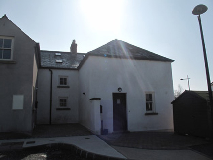 End-of-terrace L-plan three-bay two-storey house, built c.1850, having return to rear (north-west), and blank middle bay to first floor front. Part of terrace of eight. Pitched slate roof with shared red brick chimneystack and clay chimneypots, roof-lights to rear and replacement steel rainwater goods, roof hipped to rear return. Rendered walls with brick eaves course. Square-headed window openings with render reveals, painted masonry sills, and replacement two-over-two pane timber sliding sash windows. Timber casement windows to first floor to front and to rear of main block. Square-headed door opening to front having timber battened door flanked by inset tooled limestone blocks. Door opens onto cement platform enclosed by recent railings. Square-headed door opening to rear with timber battened door and squared stone step.