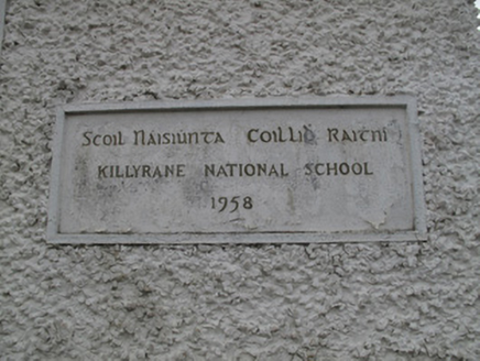 Built on the site of an earlier school, the form of this building is typical of the national schools designed in the mid-twentieth century. Strong horizontality is expressed in the use of flat roofs, reflecting the International Style which was current at the time. Although it is no longer in use as a school, much of the original form and fabric is retained, including cast-iron rainwater goods, concrete shelter, date plaque and timber sliding sash windows. The date plaque, with its Gaelic typeface lettering, is of both artistic and contextual interest.