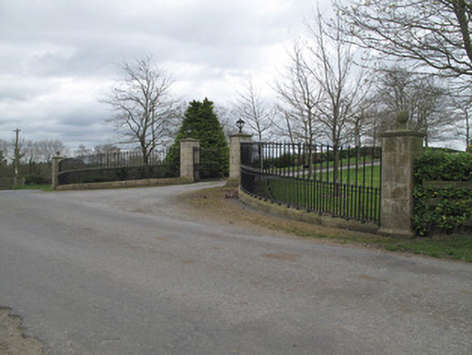 Quadrant entrance gateway to Fort Johnson country house, erected c.1800, comprising square-plan cut sandstone outer and inner piers, with moulded copings and plinths, outer having ball finials and inner having lamps. Cast-iron decorative railings on moulded sandstone plinth walls. Double-leaf cast-iron vehicular gate to centre. Detached L-plan three-bay single-storey former gate lodge, built c.1800, having lean-to extensions to rear. Hipped slate roof with terracotta ridge tiles, red brick chimneystacks with dentil course to cap, cast-iron rainwater goods and moulded render eaves course. Roughcast rendered walls having channelled render quoins and render plinth course. Square-headed window openings throughout with render reveals, painted render sills and one-over-one pane timber sliding sash windows, some with exposed sash boxes. Square-headed door opening to front (south) elevation having render reveal, timber panelled door and sidelights.