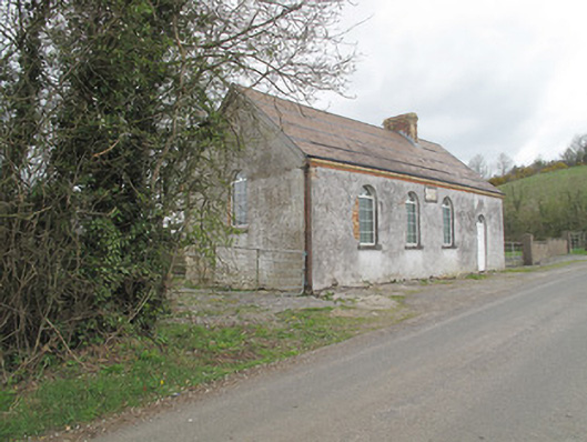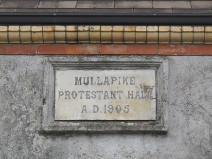 Detached four-bay single-storey hall, dated 1905. Pitched slate roof with polychrome brick chimneystack and eaves course, cast-iron rainwater goods and timber bargeboards. Ruled-and-lined render to front (south-east) elevation with some red brick walling visible. Roughcast render to side elevations and coursed rubble limestone visible to rear. Name and date plaque to wall to front, set within moulded render architrave surround, having applied lettering 'Mullaghpike Protestant Hall / 1905'. Round-headed window openings with render sills and replacement uPVC windows, red brick surrounds visible to some. Round-headed door opening to front having replacement uPVC door and fanlight. No openings to rear elevation.