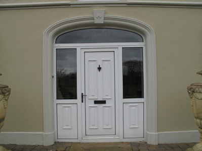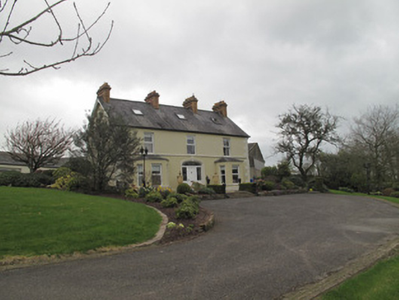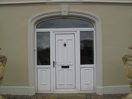 Detached three-bay two-storey house, built c.1820, having two-storey gabled return to rear (north-west) elevation and triple canted bay windows to ground floor to front elevation. Pitched slate roof with four symmetrically-placed polychrome brick chimneystacks, timber bargeboards having timber eaves supports, and replacement rainwater goods. Recent square roof-lights to front. Ruled-and-lined rendered walls with block-and-start render quoins, smooth rendered plinth course and moulded render sill course at first floor level to front. Square-headed window openings throughout, having render sills and replacement uPVC windows. Three-centred-arch door opening to front with moulded render architrave surround and dropped enlarged keystone, replacement uPVC door having sidelights and plain fanlight. Square-headed door opening to south-west elevation of rear return with replacement uPVC door.