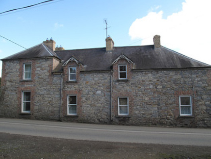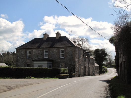 Detached L-plan three-bay two-storey house, built c.1850, having porch to front elevation, and earlier three-bay two-storey block of c.1780 to rear (south-east). Hipped slate roofs with yellow brick chimneystacks, timber eaves boards and cast-iron rainwater goods, and with roof-light to rear projection. Coursed rubble limestone walls, render removed to front and south-west elevation, having red brick block-and-start quoins to first floor and dressed limestone rubble quoins to ground floor. Smooth render to north-east elevation of older block and rear of later block. Roughcast render to porch with moulded render platband and cornice, and plain quoins. Half-dormer windows to south-west elevation, having decorative timber bargeboards and dropped finials. Gauged brick square-headed window openings with render reveals, painted masonry sills, red brick surrounds and replacement uPVC windows that mimic one-over-one pane timber sash windows. Shouldered render surround to windows to porch. Render surrounds to windows to north-east elevation of older block. Square-headed door opening to north-east elevation of porch having render surround and replacement timber battened door, with cast-iron boot scraper to front. Square-headed door openings to north-east elevation of older block, with render surrounds, stone steps and replacement timber doors. Three-bay single-storey outbuilding adjoining rear, recently refurbished, having pitched slate roof with recent roof-lights, replacement rainwater goods and yellow brick chimneystack, rubble walls to south-east and south-west, render to other elevations, square-headed window openings with red brick and render surrounds, stone sills, and replacement uPVC windows, square-headed door opening to north-east elevation with render surround and replacement uPVC door, with three stone steps. Square-headed door opening to south-east elevation having replacement uPVC door. Three-bay outbuilding to north-east of rear of house, with pitched slate roof having terracotta ridge tiles, whitewashed coursed rubble limestone walls, square-headed timber doors. Cast-iron railings on coursed rubble limestone plinth walls having render capping surrounding area to front of house. Single-leaf cast-iron pedestrian gate flanked by cast-iron fluted and banded piers to north-west of house. Pair of round-plan rubble limestone piers with render capping flanking single-leaf cast-iron vehicular gate to north of house.