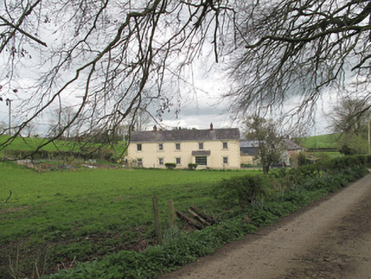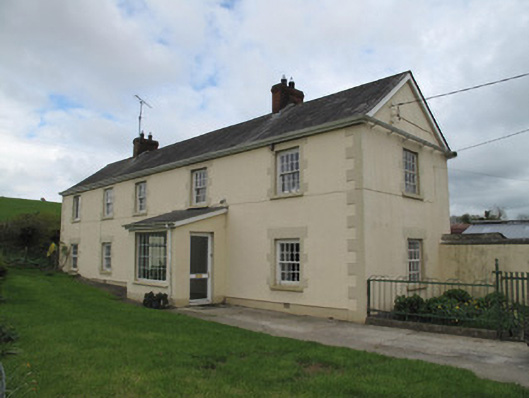 Detached five-bay two-storey house, built c.1790, having two-storey gabled return and lean-to extensions to rear (east) elevation, and with recent lean-to porch to front elevation. Pitched slate roof with red brick chimneystacks, recent square roof-lights, and replacement rainwater goods. Roughcast rendered walls having block-and-start render quoins and render plinth course. Ruled-and-lined render to porch. Square-headed window openings, front having rendered lintels and surrounds, painted tooled stone sills, and eight-over-eight pane timber sliding sash windows. Rear windows have render sills and replacement uPVC windows, and north elevation of lean-to to rear has eight-over-four pane timber sliding sash windows. Replacement uPVC and timber doors to porch and rear. Covered well, no longer in use, to south-west of house, with barrel roof, red brick walls and two-ordered segmental-headed opening to well. Three-bay two-storey outbuilding to south-east of house having lean-to to east side, pitched slate roof with red brick chimneystack, and cast-iron rainwater goods, roughcast rendered walls, square-headed timber windows and stone sills, and segmental-headed double-leaf timber battened door. Square-headed corrugated-iron door to front elevation of lean-to. Cast-iron railings on render plinth wall, with wrought-iron single-leaf gate enclosing garden to east of house.