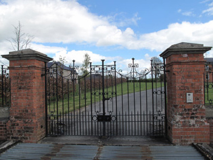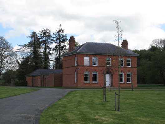 Detached five-bay two-storey parochial house, built c.1910. Hipped slate roof with red brick chimneystacks. Red brick walls having red brick plinth course, and impost courses to first and ground floors. Continuous sandstone sill course to first floor windows. Gauged-brick segmental-headed window openings with masonry sills, terracotta keystones, and one-over-one pane timber sliding sash windows. Gauged-brick round-headed door opening to front (west) elevation having timber panelled door and plain glazed fanlight, flanked by stone Doric-style columns on plinth bases, with hood-moulding over, and door opens onto platform with two nosed steps. Yard of red brick outbuildings to rear of house, with red brick boundary wall. Pair of square-plan red brick gate piers to north-west of house with tooled limestone capping, string course, and chamfered corners, flanking double-leaf cast-iron gate having matching railings on red brick plinth wall.