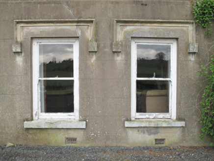 Detached three-bay single-storey house, built c.1800, with dormer floor, having lean-to extension to south-west with gable-fronted single-storey block forming return, and two-storey gabled return to rear (north-west) elevation, with lean-to extensions to north-east elevations of returns. Recent porch to front (south-east) elevation. Pitched slate roof having half-dormer windows to front elevation. Terracotta ridge tiles, yellow brick chimneystacks with clay chimneypots, terracotta ball finials to dormer windows, timber bargeboards and cast-iron rainwater goods. Pitched slate roofs and red brick chimneystacks to returns. Ruled-and-lined rendered walls to main building, roughcast render having render plinth course to rear. Square-headed window openings throughout, with painted render sills and replacement uPVC windows. Moulded render hood-mouldings to ground floor front windows, one having recent render surround. Square-headed window openings to rear and side elevations with render reveals, concrete sills and replacement aluminium and uPVC windows. Two-storey outbuilding to rear with pitched slate roof, red brick chimneystack, and replacement rainwater goods, roughcast rendered rubble limestone and sandstone walls, square-headed window openings to first floor, now blocked, and square-headed door openings to ground floor having timber battened doors. House set back from road in landscaped grounds.