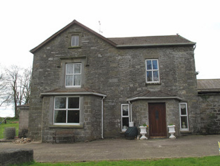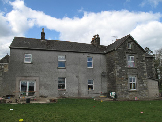 Detached two-storey house, built c.1800 and extended c.1870, former part being four-bay with rendered walls and latter two-bay with exposed stonework, latter also having gable-fronted bays to south-east and north-east, latter elevation having canted projections. Gabled return to rear (north-west) elevation, and with recent porch to rear. Pitched slate roof with terracotta ridge tiles, cut-stone chimneystacks having clay chimneypots, timber bargeboards, and replacement rainwater goods. Hipped slate roofs to canted projections. Coursed rubble sandstone and limestone walls with squared sandstone block-and-start quoins, roughcast rendered walls to rear and south-west of front elevation, render plinth course to rear. Square-headed window openings having replacement uPVC windows throughout, some with render sills. Tooled limestone surrounds to south-east and north-east gables, having render sills and tooled stone label-mouldings. Square-headed door opening to one canted projection, having timber battened door.