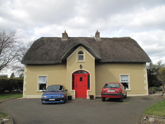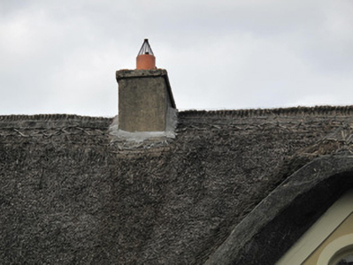 Detached three-bay single-storey vernacular, built c.1820, with attic and having gabled projecting entrance bay to front (south) elevation, and gabled return to middle of rear elevation. Pitched reed thatched roof with flush wrapped ridge having decorative cross sparring, low paired, rendered chimneystacks, and timber eaves course. Recent down-pipe to west elevation. Rendered walls, ruled-and-lined to rear, having render plinth course and block-and-start quoins. Square-headed window openings with replacement uPVC windows, and render sills, and with render surrounds to front, east and west elevations. Round-headed window opening at attic floor level in entrance projection, with render surround and sill, and timber-framed lattice window. Square-headed window opening to east elevation of rear return with stained-glass panels. Segmental-headed door opening to front having replacement fittings, and render surround. Square-headed door opening to west end of rear return with replacement uPVC door. Lawn to front of house.
