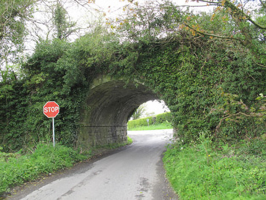 Single-arch railway bridge, built c.1858, carrying Portadown & Cavan Branch of Ulster Railway over road. Coursed rock-faced rusticated limestone to abutment walls, wings, spandrel walls and parapets, having tooled copings to parapets, abutments and tooled string course at impost level. Projecting tapered buttresses flanking arch to each elevation, with rusticated and margined quoins. Segmental arch having rusticated and margined stone voussoirs and brick voussoirs. Round arch opening to culvert to south-east elevation.