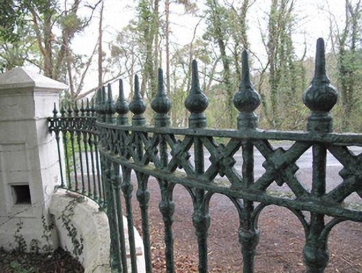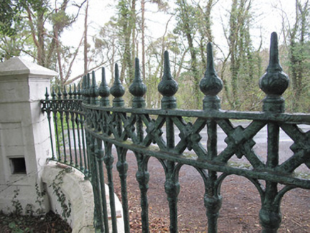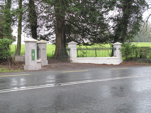 This modest gateway expresses a subtle sense of grandeur. The decorative cast-iron railings have a pleasing curve enhancing the classical design augmented by the formality of the tooled stone capping to piers and plinth wall. The public post box adds contextual interest, while the integral letter-slot to a hollow pier to the west, intended to hold post for the house, is a more unusual feature. That this entrance was erected at a later date to the house suggests that improvements were being made to the demesne landscape at this time.