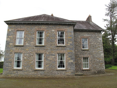 Detached irregular-plan two-storey four-bay house, built c.1800 and remodelled c.1880, with attic, having projecting end-bay to north-west elevation, and central return and single-storey extension to rear (south-west) elevation. Slate roof, hipped to return and south-east elevation, pitched to north-west. Overhanging eaves with timber eaves brackets, red brick chimneystacks, and mixed cast-iron and replacement rainwater goods. Decorative timber bargeboards to pitched roof. Coursed rubble sandstone and limestone to front, rear and south-east elevations, random rubble cladding to north-west elevation and rear of return, roughly squared block-and-start quoins. Gauged brick square-headed window openings throughout, having red brick block-and-start surrounds, replacement uPVC windows imitating six-over-six pane timber sliding sash. Tooled stone sills to front, masonry sills to sides and rear. Gauged-brick round-headed window opening to rear return, masonry sill, brick surround and replacement uPVC window. Gauged-brick square-headed door opening to north-west elevation of main block to front, single-leaf timber panelled door having overlight and red brick block-and-start surrounds, opening onto render platform. Gauged-brick square-headed door and window openings to rear of extension and to south-east of return with red-brick surrounds, replacement uPVC doors and windows. Six-bay two-storey outbuilding, adjoining north-west elevation of house, to rear, with pitched corrugated-iron roof and coursed rubble stone walls. Square-headed window openings having render sills, red brick surrounds, gauged-brick segmental-headed openings, all openings blocked. Coursed rubble wall enclosing yard to rear with double-leaf steel gate. Coursed rubble stone wall and hedge enclosing garden to front of house, single-leaf wrought-iron gate flanked by fluted cast-iron columns to wall to south-east of house. Three-bay single-storey gate lodge to road entrance, with pitched tiled roof having red-clay ridge tile ridge cresting and finials, rendered walls, gabled porch with red-clay tile cresting, polychrome walls with limestone plinth blocks and replacement timber door and uPVC windows. Gateway comprises square-plan polychrome brick piers with ovolo moulding to corners, chamfered plinths and caps, and decorative double-leaf wrought-iron gate, flanked by polychrome brick walling.