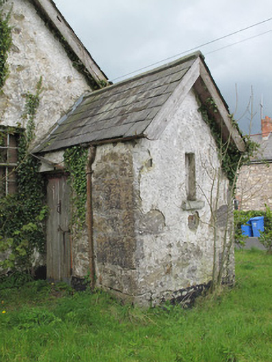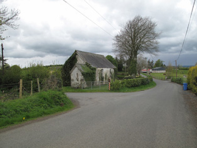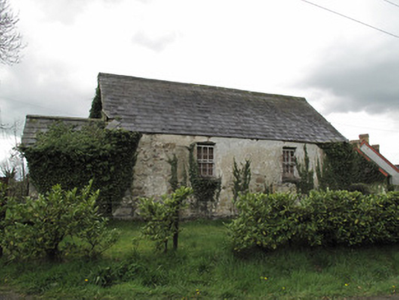 Detached two-bay single-storey national school, built c.1860, having lower porch recessed slightly to south elevation, and single-bay single-storey outbuilding adjoining rear (west) elevation. Pitched slate roof, with timber bargeboards and cast-iron rainwater goods, and with rooflights to rear. Pitched corrugated-iron roof to outbuilding. Rubble limestone and sandstone walls, roughcast-rendered in places. Square-headed window openings to front (east), north and south elevations, having tooled stone sills, render reveals, gauged red brick voussoirs, and six-over-six pane timber sliding sash windows, glass mostly missing. Square-headed window opening to south elevation of porch with tooled stone sill and timber surround. Square-headed door opening to west of porch having render surround and double-leaf timber battened door.