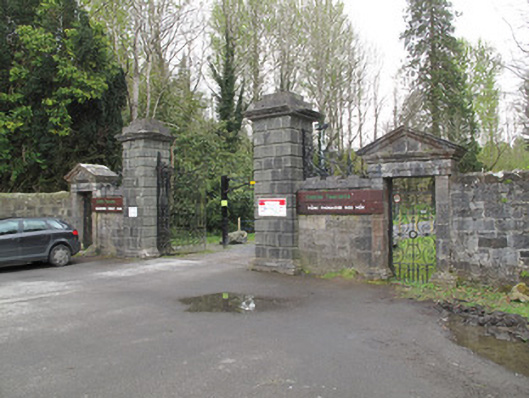 This imposing and ornate gateway, providing the main entrance to Rossmore Castle, was well designed and executed. Cast-iron work to the gates provides a contrast to the commanding aspect of the piers. The whole is enhanced by the fine stonework and the symmetrical layout.