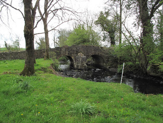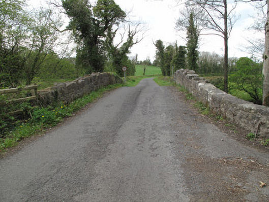Double-arch humpback bridge, built c.1800, carrying road over stream. Round arches having dressed sandstone voussoirs and gunnelled soffits, arches and central pier reinforced with concrete. V-shaped cutwaters of squared stone to each elevation, having conical caps. Random rubble stone to spandrels and parapets, portions of ribbon dressed rusticated stone copings to parapets.