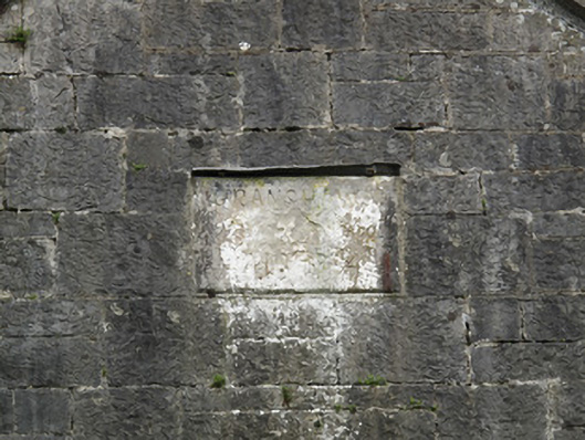 Detached three-bay single-storey school, dated 1884, having projecting gabled entrance bay to front (west) elevation. No longer in use. Hipped slate roof, pitched to entrance projection, with clay ridge tiles, roughcast rendered chimneystack, and with tooled limestone coping to front gable. Coursed squared limestone and sandstone walls having dressed block-and-start sandstone quoins and plinth course. Limestone plaque to front inscribed 'Gransha[?] National School AD 1884'. Gauged-brick square-headed window openings, boarded up with corrugated-iron sheeting, having red brick surrounds and sandstone sills. Gauged-brick square-headed door opening to front with red brick surround and sheet timber door, and sandstone step. Remains of former outbuilding to rear (east), overgrown, having coursed rubble stone walls. Rendered rubble stone wall to front with render capping.