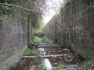 Canal lock on former Ulster Canal, built c.1840. Sluice gates absent and lock no longer in use. Cut stone to base of canal to west, openings for ground sluices to side walls, with tooled stone to sill. Coursed, peck-dressed limestone and sandstone walls with tooled copings, and lock gate emplacements visible to each end. Recesses to tail-gate emplacements to west, to accommodate open sluice gates. Stop-grooves to each side wall to west of tail-gate emplacements. Curved walls to west of lock visible.