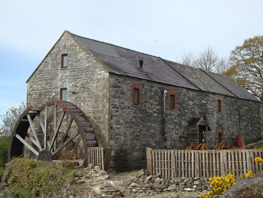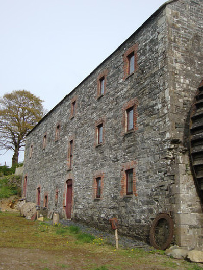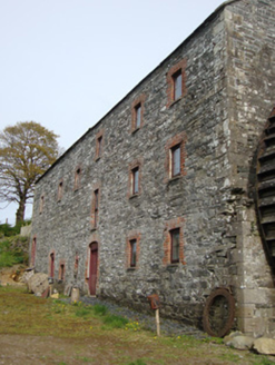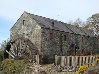Detached six-bay three-storey water-powered corn mill and kiln, built c.1850. Now converted for residential use. Three bays to south-west end incorporating mill, kiln in two middle bays, store to end bay at north-east. Pitched natural slate roof with raised verges, artificial slate to kiln section. Coursed rubble limestone walls with dressed stone quoins. Large water-wheel to west gable, with cast-iron axle, hub and rim, timber spokes and angled buckets. Square-headed window openings with replacement timber casement windows with concrete sills throughout. Brick block-and-start surrounds to window openings to north, south and east elevations. Triple-centred-arch door openings with red brick surrounds, each with square-headed doors and red brick infill over. Original nineteenth-century timber panelled door to former store on west elevation, Timber battened and plywood-covered doors to two openings to south elevation, three door openings to former mill, kiln and store on north elevation. Situated on slope to south of third-class road off secondary road.