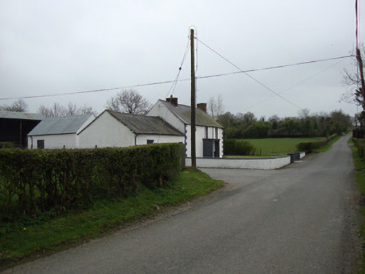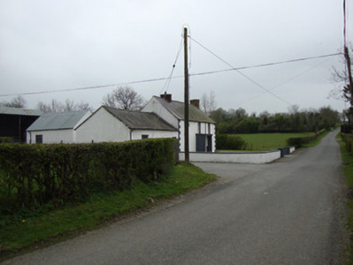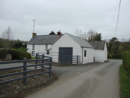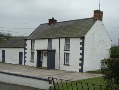 Detached three-bay two-storey vernacular house, built c.1800, with shallow flat-roofed windbreak, and two-bay single-storey outbuilding to east end. Trace of former addition to west gable. Pitched replacement slate roof, with cast-iron rainwater goods, polychrome red and yellow brick chimneystack to west gable and replacement red brick to east. Roughcast-rendered walls, having painted quoins. Square-headed window openings with one-over-one pane timber sliding sash windows, having rendered and painted reveals and painted stone sills, some replacement timber casement windows to south elevation. Square-headed entrance door, with part-glazed timber panelled door with sidelights and rendered risers. Outbuilding has pitched slate roof, roughcast-rendered walls, two square-headed door openings to front and one to rear, with timber battened doors, and with square-headed timber window opening to rear. Single-storey outbuilding to south having pitched corrugated-iron roof and rendered walls, square-headed timber battened double-leaf door and one-over-one pane timber sliding sash window. Located at corner of two third-class roads, with low plinth wall curving at corner.