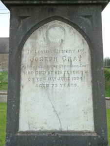 Freestanding carved limestone funerary monument dedicated to Joseph Grey of Rockfield House, erected c.1884. Rectangular-plan plinth and base, moulded cornice below tapering octagonal-plan pinnacle with egg-shaped finial. Pointed-arch insets with marble plaques to east and west faces, inscribed with dedication to Grey to east face, marble lancet plaque to north and south faces. Located to south-west of west entrance of Braddocks Presbyterian Church.