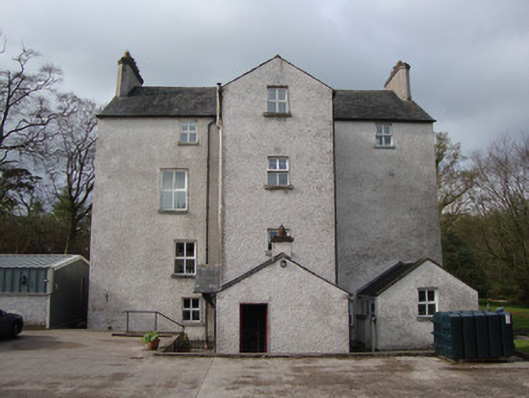 Detached three-storey over basement glebe house, built 1742, having five-bay first floor and three-bay ground and top floors, gabled porch to front elevation, and with single-bay return and two single-storey additions to rear (east). Now in use as private house. Pitched replacement slate roof, having three gable-fronted dormer windows to front elevation, replacement uPVC rainwater goods, and rendered chimneystacks to gable ends having canted ends and replacement terracotta chimney pots. Smooth rendered walls to west elevation, roughcast elsewhere, having blank shields to gables of porch and dormers. Square-headed window replacement uPVC windows throughout, irregularly sized and spaced to rear additions. Label-moulding to central dormer. Porch spans basement area, and has triangulated parapet, square-headed replacement timber door, and approached by three limestone steps flanked by rendered plinth walls. Meandering tarmac driveway approaching house, located on former Dublin to Derry road.
