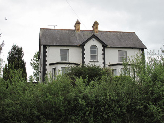 Detached three-bay two-storey house, built c.1920, having full-height gabled slightly projecting entrance bay, flanked by canted bay windows to front (north-west) elevation, two-bay gable elevations, and addition to rear. Pitched slate roof, with terracotta ridge tiles, cast-iron rainwater goods and polychrome brick chimneystacks. Roughcast rendered walls, having painted brick block-and-start quoins. Square-headed window openings mainly, with round-headed window to first floor of entrance projection, with render reveals and one-over-one-pane timber sliding sash windows. Double-leaf steel gate to north-east, flanked by square-plan painted masonry piers with panelled detailing and decorative caps with finials.