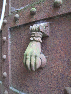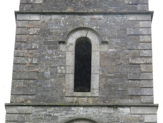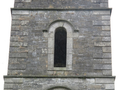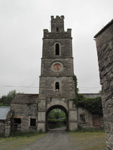 Attached square-plan four-stage bell-tower, erected c.1860, having narrow belfry above top stage with crenellated top to belfry and crenellations to parapet of tower. Roughly coursed squared rubble stone walls, with dressed block-and-start stone quoins and with string courses between stages. Shouldered dressed stone abutments to south elevation. Round-headed openings to each elevation of each stage having dressed stone surrounds, hood-mouldings to openings to top stage. Oculus to south elevation of third stage, possibly formerly having clock, with dressed stone surround and stone hood-moulding. Round carriage arch, having dressed stone surround and red brick soffit. Double-leaf metal door to north elevation, with hand-shaped cast-iron knockers. Round-headed door opening to east elevation of interior of arch, having dressed stone surround and metal door. Outbuildings attached.
