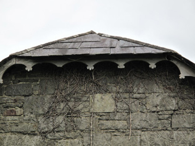 Detached three-bay two-storey Orange hall, built c.1860, having lean-to porch to front (south-east) elevation, two-bay gable ends, and two-storey gable-fronted return to rear to centre of rear elevation. Not in use. Half-hipped slate roof, with decorative timber bargeboards, rendered ridge tiles, and rendered chimneystack. Coursed roughly squared rubble limestone walls, having rusticated block-and-start quoins. Square-headed dressed stone window openings with dressed stone sills, openings blocked to first floor and boarded up to ground floor. Fixed timber window to porch. Square-headed door opening to south-west elevation of porch, having stone lintel and timber battened door. Metal-framed windows to north-east gable. Gauged dressed stone square-headed door opening to south-west elevation of rear return, timber battened door. Set slightly back from road in own grounds.