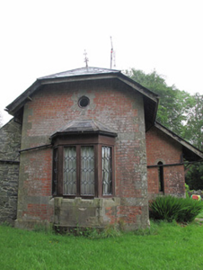 Detached three-bay single-storey gate lodge with attic floor, built c.1875, having projecting porch to front under catslide roof, canted bay window to west gable, slightly recessed addition catslide projection to rear, and recent flat-roof extension also to rear. Half-hipped slate roof with red brick chimneystack, terracotta ridge cresting with cast-iron finials, cast-iron rainwater goods, and timber eaves. Timber brackets to roof of porch. Red brick walls laid in English Garden Wall bond, with dressed sandstone block-and-start quoins, plat-band and plinth course. Rubble stone and rendered walls to rear additions. Bay window has rendered riser, timber mullions and hexagonal cast-iron latticed panes. Glazed oculus to apex of same elevation, with dressed sandstone surround. Triangular-headed window openings to front and upper east elevation, with dressed sandstone surrounds, chamfered sills and hexagonal cast-iron latticed windows. Pointed-arch window openings to side elevations of porch, with dressed sandstone sill and hood, and plain glazed windows. Square-headed timber battened door to porch, opening onto sandstone step. Double-leaf cast-iron gates flanked by square-plan squared sandstone piers having pointed stone caps, to south-east.