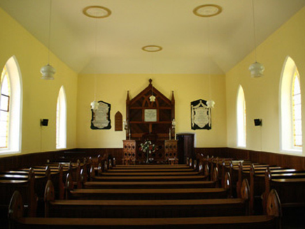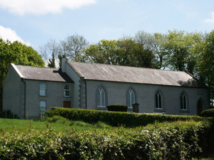 Detached single-cell Presbyterian church, built 1803, renovated and modernised in 1828 and 1889, having five-bay front elevation, and lower recessed two-bay two-storey block to north end, with cast-iron rainwater goods. Pitched slate roof with rendered copings, with rendered chimneystack to junction of blocks. Roughcast-rendered walls with rendered quoins. Pointed-arch window openings to long walls, with rendered surrounds and Y-tracery stained-glass windows.. Pointed-arch doorway to west end of front elevation with timber battened door, having plaque overhead. Recessed block has similar roof and walling treatment and square-headed openings with replacement uPVC windows and timber door. Smooth rendered walls to interior, having carved marble memorial plaques to north elevation, flat plastered ceiling with chamfered coving, plaster medallions to light fixtures, nineteenth-century timber pews with trefoil ornament, open choir boxes to north-east corner, nineteenth-century carved timber pulpit to centre of north end approached by steps on west elevation and having carved quatrefoil ornament to canted front. Square-headed door opening from north-east of nave, accessing meeting rooms and sexton's house. Two square-headed timber panelled doors accessing vestibule at south end, with smooth rendered walls and timber panelled dado. Timber stairs from vestibule to gallery. Gallery having carved timber pews and carved quatrefoil balustrade, supported on single fluted cast-iron round-plan column.