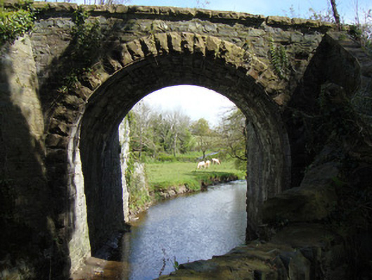 The Dundalk-Enniskillen Branch of the Ulster Railway (later subsumed into the Great Northern Railway) opened from Ballybay to Newbliss on 14th August 1855, and was an important transport link between Louth, Monaghan and Fermanagh until its closure in 1959. This well-composed bridge is representative of the skill in engineering and stoneworking in the nineteenth century, with rusticated stone voussoirs enhancing the tall, elegant arch. The former railway bridge carried the railway over Dromore River Upper and is an aesthetically-pleasing structure, serving as a physical reminder of the extent and social and industrial importance of the railway network in the late nineteenth and twentieth centuries. A masonry road bridge spans the river to the west, and the railway line continued west to Shantonagh Junction over a beam bridge, since dismantled.