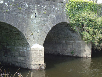 Triple-arch road bridge over Dromore River, built c.1830. Elliptical arches with cut peck-dressed limestone voussoirs, and squared coursed and snecked rubble stone soffits. Squared limestone parapet walls, with rusticated copings, stretching to north and south, covering extensive flood plains to east and west. V-shaped cutwaters of coursed squared stones to east and west elevations.