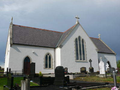 Freestanding cruciform-plan Roman Catholic Church, built 1837 and enlarged 1886, having ashlar belfry to rear gable (south) and addition to south-east. Pitched slate roof having decorative ridge cresting, stone copings with cross gable finials, and cast-iron rainwater goods. Painted ruled-and-lined rendered walls set on painted rendered plinth. Pointed-arch window openings having painted stone block-and-start surrounds with stone sills and Y-traceried windows. Triple lancet window to front (north) gable having painted stone block-and-start surround with painted stone sill. Quatrefoil windows to east and west gables having painted stone surrounds. Pointed-arch door openings to front elevation having painted timber tongued-and-grooved double-leaf doors with overlights. Square-headed door opening to addition, having painted rendered surround and timber tongued-and-grooved door. Interior having painted rendered walls, stained-glass windows, exposed timber beam ceiling, timber galleries to east and west and timber pews. Series of granite steps leading to front of church. Building set within graveyard on elevated site. Square-plan coursed limestone piers having metal gates and coursed limestone walls to front boundary with hedgerow and mature trees to remaining boundaries.